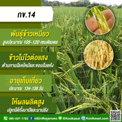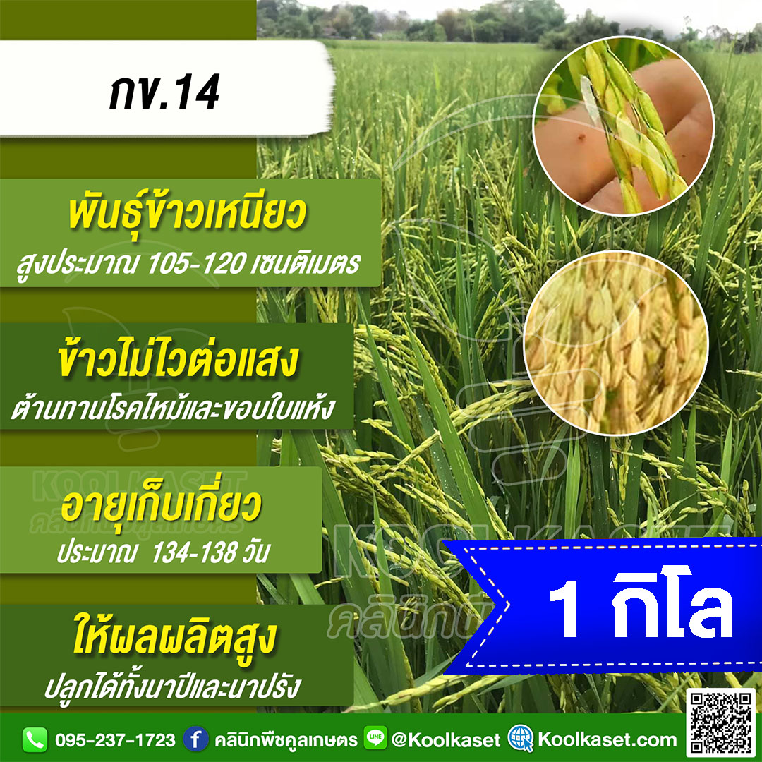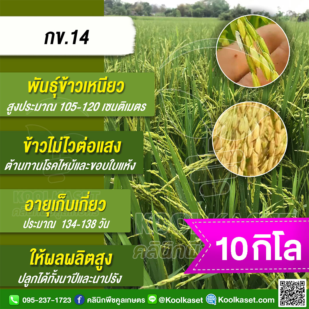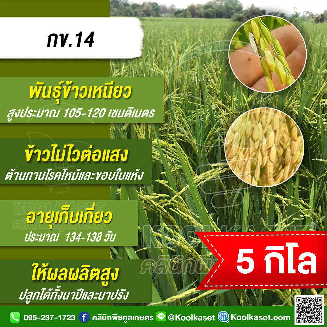 เมล็ดพันธุ์ข้าว ข้าวเหนียว กข.14 นาปี นาปรัง ไม่ไวแสง เหนียวนุ่ม 25 กก. คลินิกพืชคูลเกษตร KR34