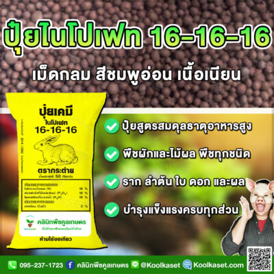 ปุ๋ยตรากระต่าย 16-16-16 ใช้ได้กับทุกพืช โดยเฉพาะพืชผัก ไม้ผล เพื่อเร่งการเจริญเติบโตทุกส่วนของพืช