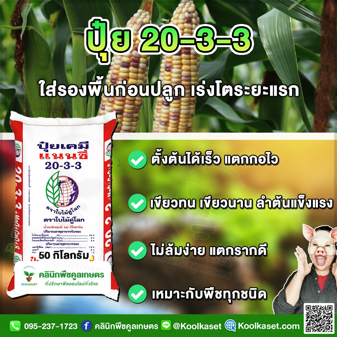 ปุ๋ยตราแนนซี่ 20-3-3 สูตรรองพื้น เร่งต้น เร่งการเติบโตระยะแรก เหมาะสำหรับรองพื้นพืชไร่ เช่น ข้าวโพด มันสำปะหลัง อ้อย ให้อาหารในช่วงแรก ทำให้พืชเจริญเติบโตได้ดี