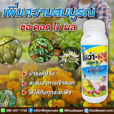 โนว่า-เอส 13-13-13 สูตรเข้มข้น บำรุง ต้น ดอก ผล ขยายขนาดใบ ใบเขียว ใบหนา ขยายผล ลดการหลุดร่วง คลินิกพืชคูลเกษตร